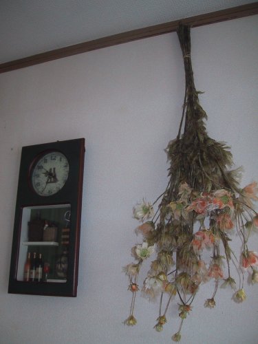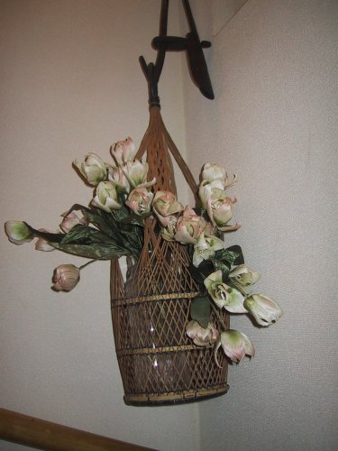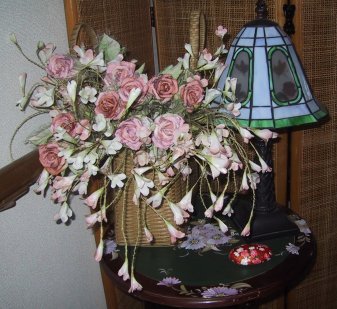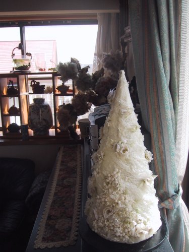 <材料> オーガンジー・デシン・ジョーゼット・ 三角錐の土台に染めたジョーゼットの布を巻き、一個2cm程の小花を40〜60個はりつけていく。 薔薇のほか4種類の小花を作るのに時間がかかった。 花をはりつけて行く作業が楽しく、小花作りの苦労も忘れてしまった。 明かりを入れるとガラスのペップがキラキラ光り春のお花畑のよう・・・
