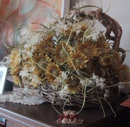 オーガンジーの揺れる小花との組み合わせ。ひまわりの花芯、パイルの色のグラデーションが可愛い。 |