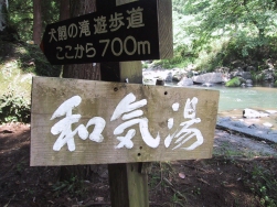 秘湯?・・ 霧島にもこんな所があったなんて。車一台やっと通れる道を下って行くと川があり、人家の奥に露天風呂がある。石鹸、桶がおいてあり管理はされているらしい。お代は、「志」と書いた随分厳重な箱がおいてある。 犬飼の滝への散歩道につながっているので、人が通るかもしれない。しかし、温泉を目の前にして入らないとは「お花はん 女がすたる!」と妙な決意をして入りましたがな。底からぽおぁぽぁと泡がと共に湯が湧き出ている。えーえっやっぱり人が・・ゾロゾロと「あーら温泉があるんだぁ」で覗かれてしまいました。犬飼の滝に下りたり上ったりしてかいた汗はここで流し、川のせせらぎと涼風に吹かれ良いお湯でした。